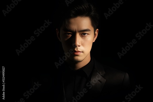 © Hendra, Naklejka premium Dramatic Black-and-White Portrait of an East Asian Man in Film-Noir Style