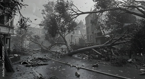 Fototapeta premium Dramatic black and white portrayal of a city street in complete disarray after a devastating hurricane, showcasing fallen trees and widespread ruin.