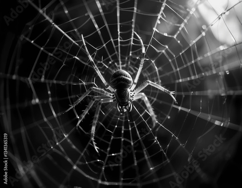 © Aboeyazied, Fototapeta premium Dramatic Black and White Spider in Web – Dark Shadows Photography