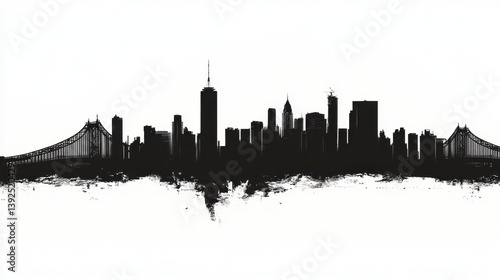 © AiPhotoSale, Naklejka premium Dramatic black silhouette of a city skyline with bridges, resting above a textured, dark smudge effect. Modern and striking