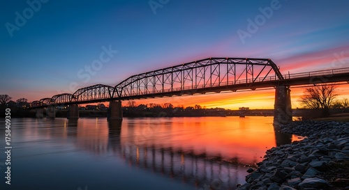© Naga, Naklejka premium Dramatic bridge silhouette against vibrant sunset sky reflecting in water