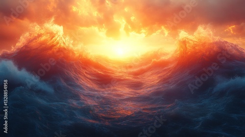 © Tichakon, Fototapeta premium dramatic capture of ocean waves crashing during sunset with the sun peering through