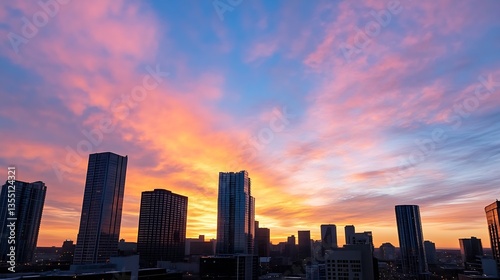 Fototapeta premium Dramatic City Skyline at Sunrise with Colorful Clouds and Tall Buildings in...