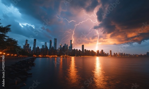 Naklejka premium Dramatic city skyline at twilight during a powerful thunderstorm with lightning striking.