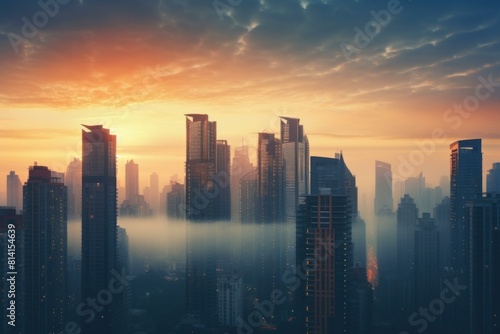 © juliars, Fototapeta premium Dramatic cityscape at dusk, skyscrapers silhouetted against a vibrant sunset sky