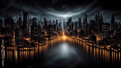 © Anjar Stock, Fototapeta premium Dramatic cityscape at night with bright water reflections and ominous clouds