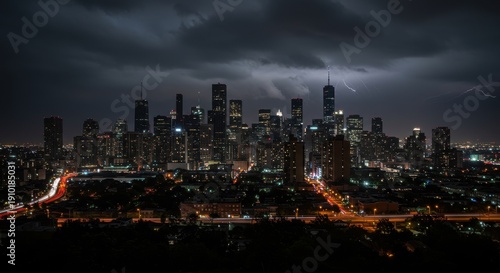 © Hard, Obraz premium Dramatic cityscape at night with lightning strikes illuminating the skyline