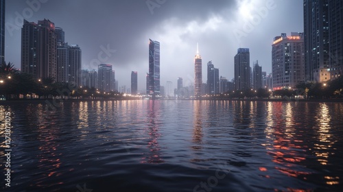 Fototapeta premium Dramatic Cityscape Reflection on Water Surface in Moody Weather at Night with City Skyline