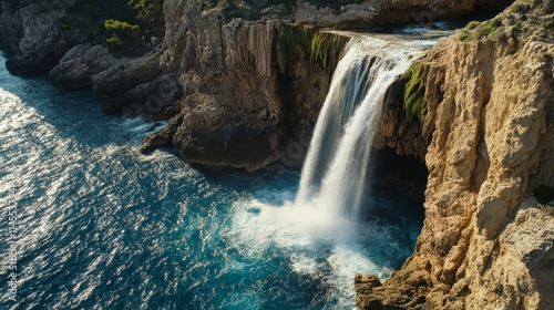 © Monchisa, Naklejka premium Dramatic Cliffside Waterfall Cascading into Serene Ocean Views