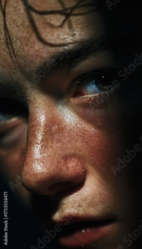 © spyrakot, Fototapeta premium Dramatic Close-Up of Dancer's Eyes in Stage Light Shadow