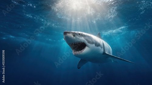© jodoto, Fototapeta premium Dramatic Close-Up of Great White Shark Swimming Toward Sunlit Ocean Surface