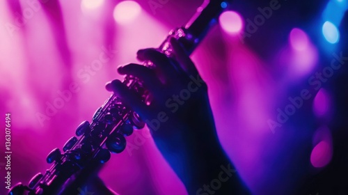 © Fauzerene, Fototapeta premium Dramatic Close-Up of Hand Playing Flute in Vibrant Stage Lighting