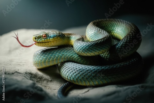 © Badiur, Naklejka premium Dramatic close-up portrait of a coiled green snake on a textured surface