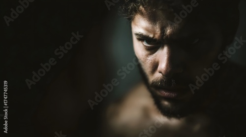 Fototapeta premium Dramatic close up portrait of a man with an intense determined expression conveying inner conflict and focus