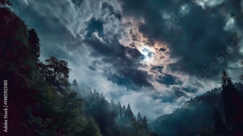 © Chom, Fototapeta premium Dramatic Cloud Formation Over Mountain Landscape with Dark Shadows and Light Breaking Through Dense Fog