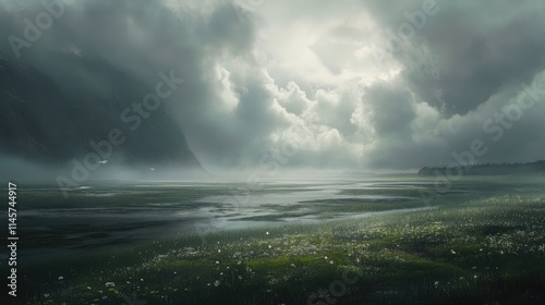© Holo Frame, Obraz premium Dramatic cloud formations over tranquil estuary landscape with lush greenery and misty atmosphere capturing serene natural beauty