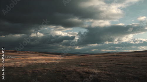 © Lucianastudio, Obraz premium Dramatic clouds cascade over a vast, golden grassland casting long shadows under a shifting sky