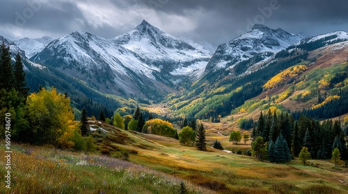 © creative, Obraz premium Dramatic clouds emerging over snow capped peaks and autumn foliage in colorado valley