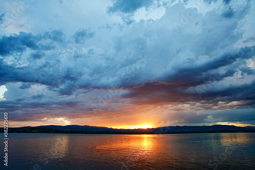 © photokrle, Obraz premium Dramatic clouds over the lake. Sunset. Storm.