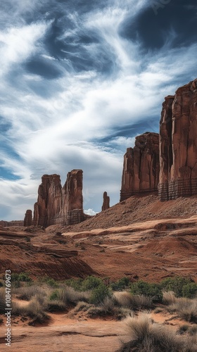 © Shozib, Fototapeta premium Dramatic cloudscape hovering over sandstone pinnacles in utah's desert landscape