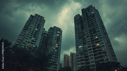 © Bussakon, Obraz premium Dramatic Cloudy Skyline of Towering High Rise Buildings in the City