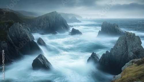© Rere_Art151, Obraz premium Dramatic Coastal Cliffs with Blurry Waves and Fog