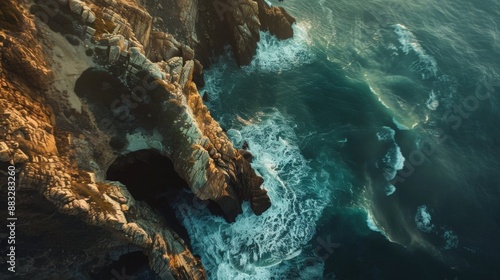 © Hafiz, Obraz premium Dramatic coastal cliffs with waves crashing on the side aerial drone photography style, with copy space