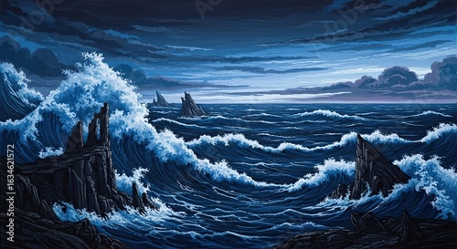 Obraz premium Dramatic coastal scene at night with crashing waves.
