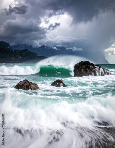 © Sumi, Fototapeta premium Dramatic coastal scene with crashing waves under a stormy sky