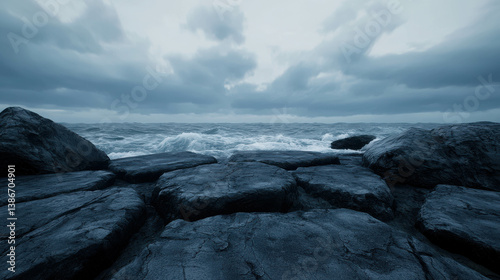 © Gun, Obraz premium Dramatic Coastal Scene with Dark Rocks and Turbulent Waves under Gloomy Sky