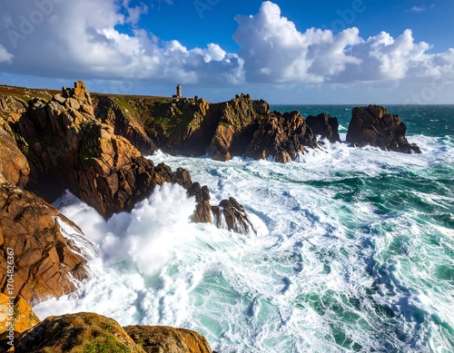 Fototapeta premium Dramatic coastal scene with rough waves crashing against rocky cliffs