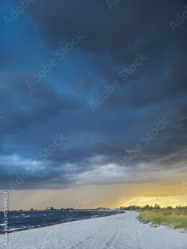 Obraz premium Dramatic coastal scene with stormy skies above a tranquil beach at sunset