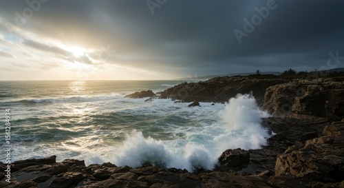 © dira, Obraz premium Dramatic coastal scene with waves crashing against rocky shoreline at sunset light