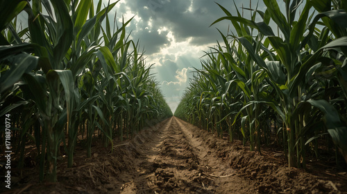 © Aran, Obraz premium Dramatic Cornfield Sky – Low-Angle Rows of Green Corn with Storm Clouds
