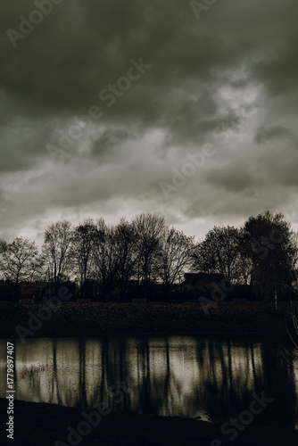 © vita, Fototapeta premium Dramatic dark autumn landscape with bare trees and cloudy sky reflecting in calm lake water. Moody nature background for fall season, overcast weather
