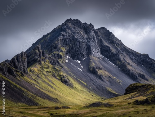 Fototapeta premium Dramatic, dark mountain peak with green slopes under a stormy sky