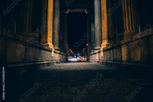 © Goeki, Obraz premium dramatic dark path through ancient columns in munich