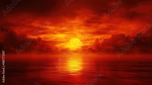 © AkuAku, Fototapeta premium Dramatic dark red background with fiery sky and golden sunset for design use
