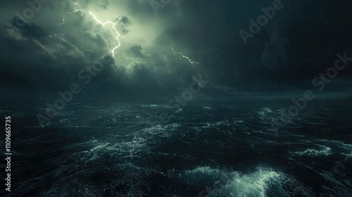 Fototapeta premium Dramatic Dark Storm Over Ocean with Lightning Striking the Sky and Tumultuous Waves Creating a Mysterious and Intense Atmosphere of Nature's Fury
