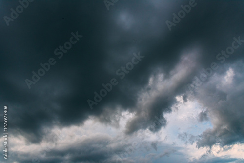 Fototapeta premium Dramatic dark storm thundercloud rain clouds on black sky background. Dark...