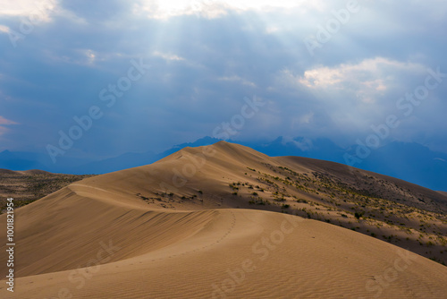 Fototapeta premium Dramatic desert dunes under sunbeams and cloudy sky
