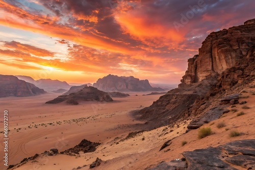 Naklejka premium Dramatic desert landscape at sunset with fiery orange sky