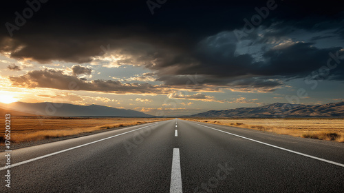 © AgungKY, Naklejka premium Dramatic desert road at sunset leading to mountains in golden light scenic