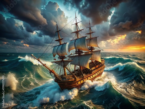 © Supittra, Fototapeta premium Dramatic Drone Shot: 3D Model Galleon Ship in a Tempestuous Sea