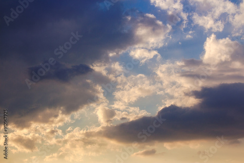 Fototapeta premium dramatic dusk. dynamic clouds on the sky in golden light above the horizon. summer holidays rainy weather forecast