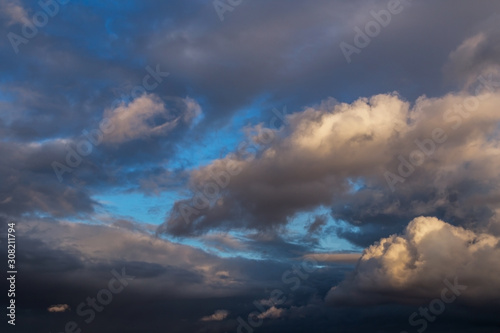 © Viktor Iden, Obraz premium Dramatic epic storm grey cumulus clouds against blue sky background texture