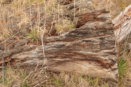 © Mike, Obraz premium Dramatic exposed grain driftwood patterns and texture with brown beach grass foreground