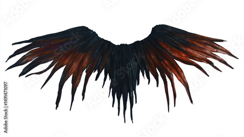 Fototapeta premium Dramatic feathered wings in shades of black and fiery copper against white...