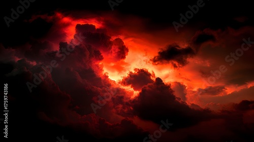 Naklejka premium Dramatic fiery red clouds glow intensely against dark sky.