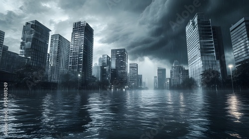 © Ytnart, Fototapeta premium Dramatic flood in modern city with dark storm clouds, showcasing the power of nature over urban structures, symbolizing climate change effects.